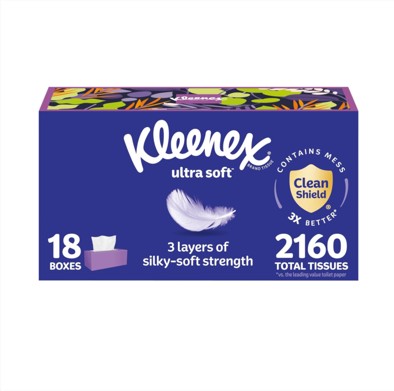 Kleenex Ultra Soft ansiktsservietter, 18 flate esker, 120 servietter hver (totalt 2160).