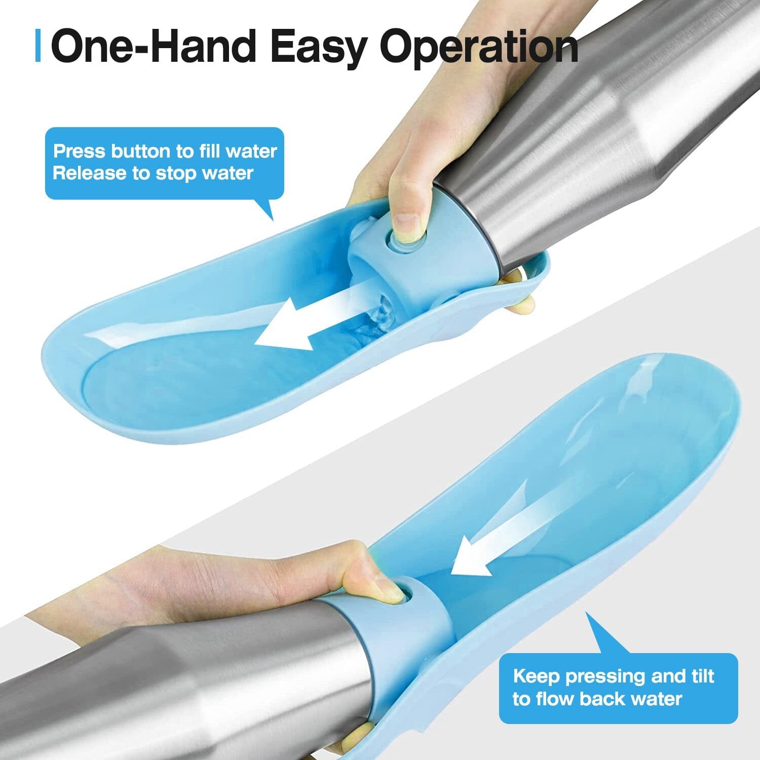 Dogs need to drink lots of water to stay healthy every day. especially during hot summer outdoor activities. Our 25oz large capacity dog water bottle combines water bowl. give your dog enough fresh water and more comfortable and natural drinking experience. This water bottle is easy to use and adopt leak-proof design. The unused water can flow back into bottle to avoid unnecessary waste. Made of stainless steel material. our odorless. durable and anti-drop. Perfect gift for your furry friend in this hot and thirsty summer.