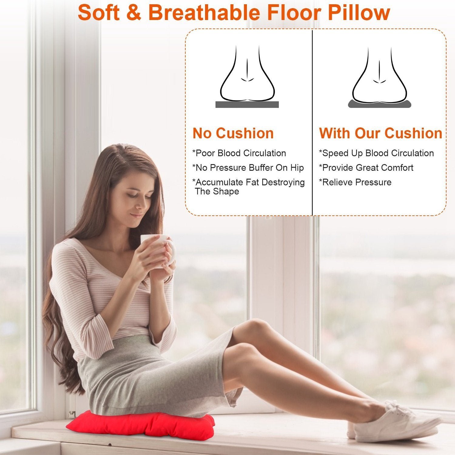 - Ultra-Soft Seat Cushion: The seat cushion is made of skin-friendly Polyester Fiber fabric and the filling is Pearl cotton. the floor pillow is breathable and comfortable. relaxing your hips and releasing your pressure which is perfect for those who like to sit on the floor to eat. read. meditate. yoga. play games with kids. watching TV or play video games.