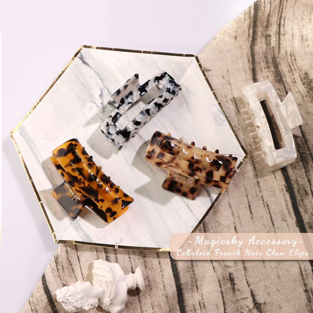 - Material: Made of high-quality plastic acrylic resin and alloy. The metal spring is covered with plastic. anti-rust and more durable. The large claws have eight Teeth Clamps. which are non- slip. so it can hold the hair firmly.