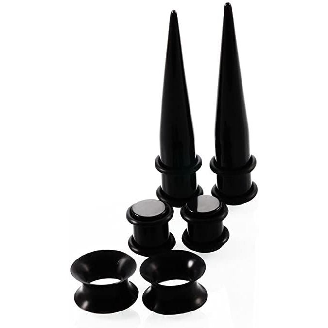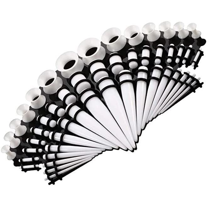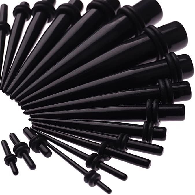 - 18 Pieces Acrylic Tapers with Double O-Rings – 14G (1.6mm). 12G (2mm). 10G (2.5mm). 8G (3mm). 6G (4mm). 4G (5mm). 2G (6mm). 0G (8mm). 00G (10mm)
