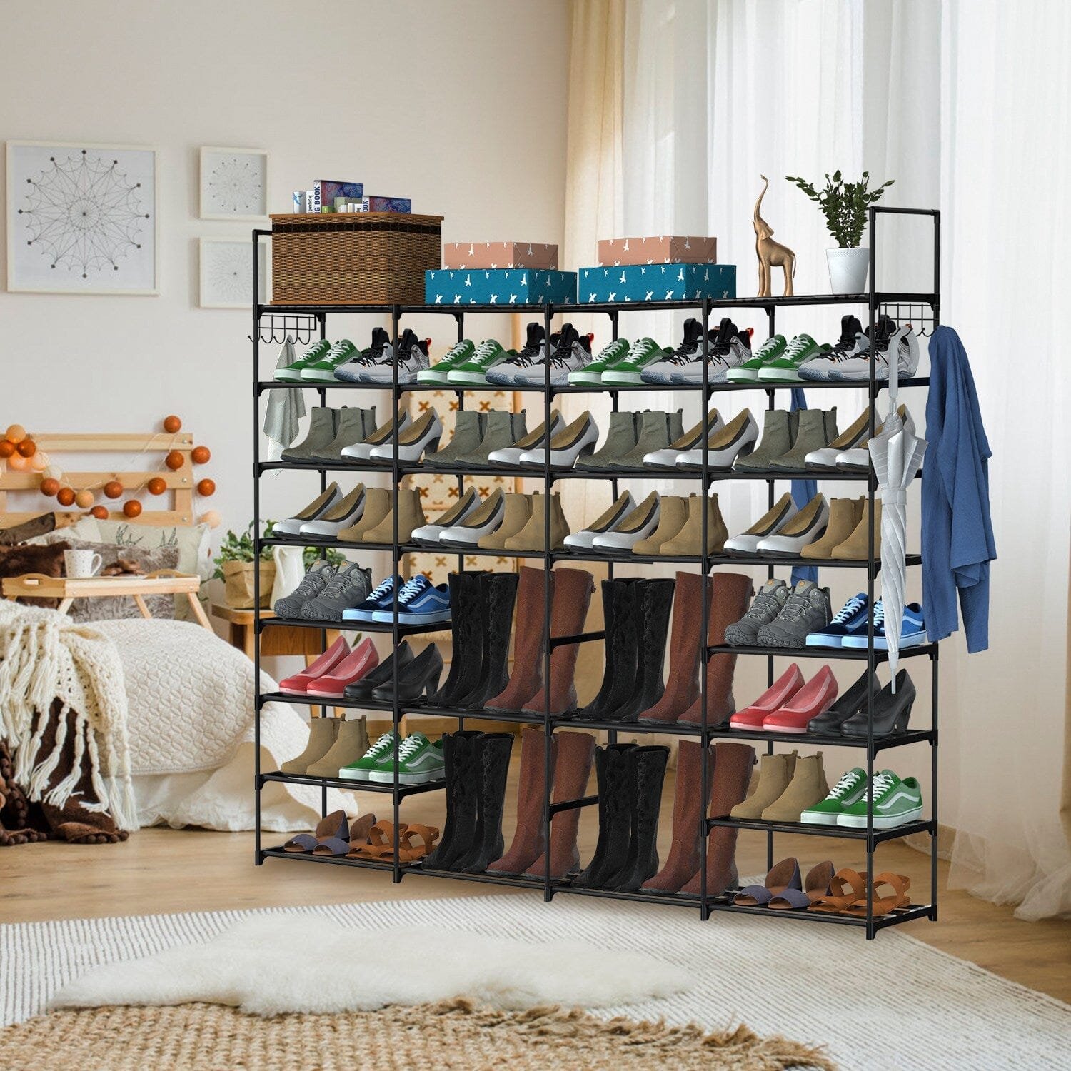 • 8-Tier 3-Row Shoe Rack: With 8 tiers on two side rows and 5 tiers on the middle row. the shoe organizer shelf is 50.79×10.63×56.69in. which can store about 42 pairs of shoes including 6 pairs of boots. Comes with 2 hooks which can hang your bags. ties. keys. purses. earrings. belts. scarves. etc.. 3Pcs PP sheets can be placed on the top to hold some toys. books. hats and other small items.