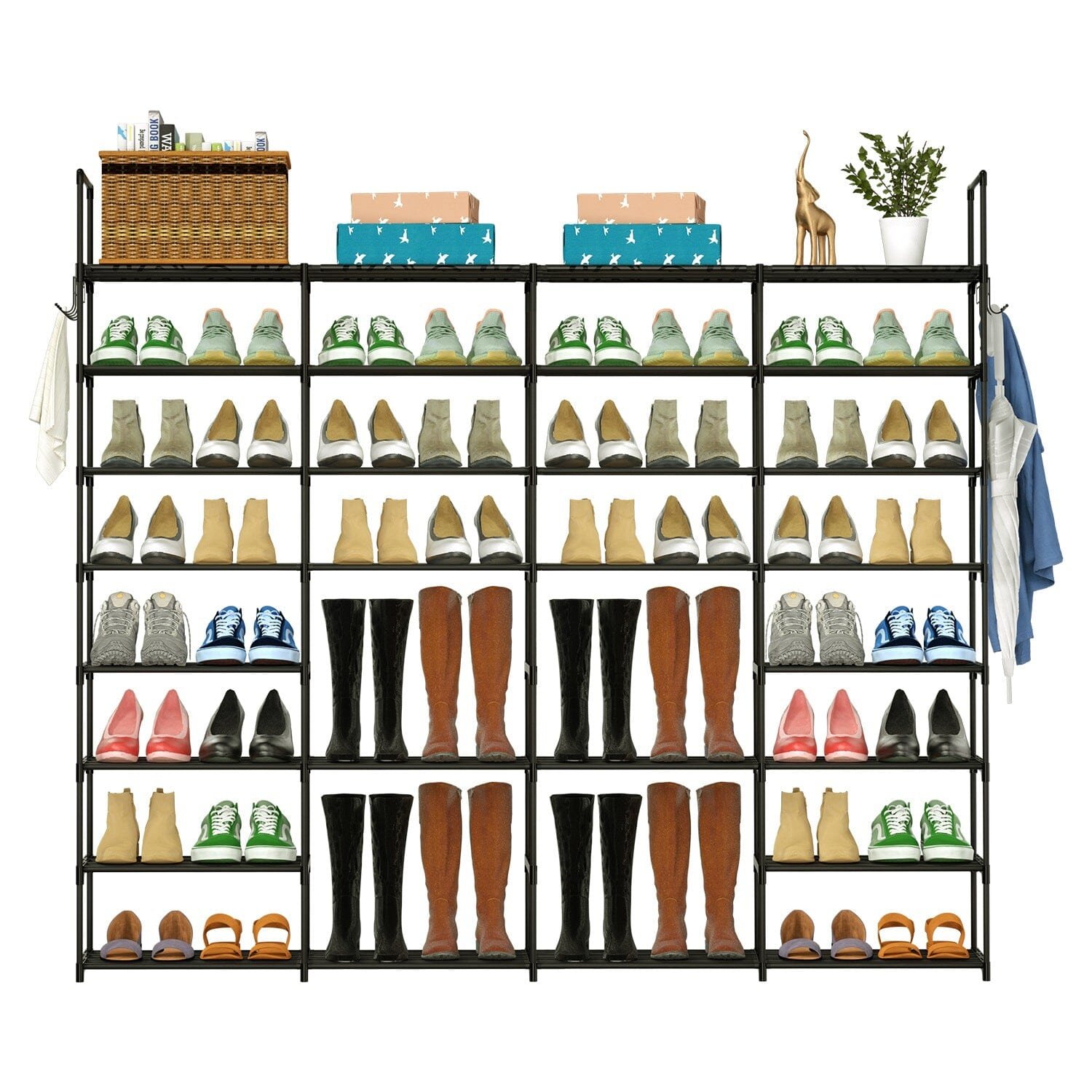 • 8-Tier 4-Row Shoe Rack: With 8 tiers on two side rows and 6 tiers on the middle two rows. the shoe organizer shelf is 67.72×10.63×56.69in. which can store about 56 pairs of shoes including 8 pairs of boots. Comes with 2 hooks which can hang your bags. ties. keys. purses. earrings. belts. scarves. etc.. 4Pcs PP sheets can be placed on the top to hold some toys. books. hats and other small items.