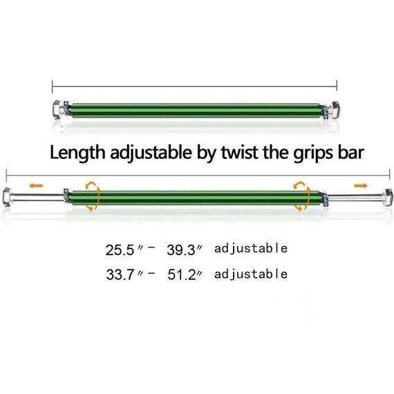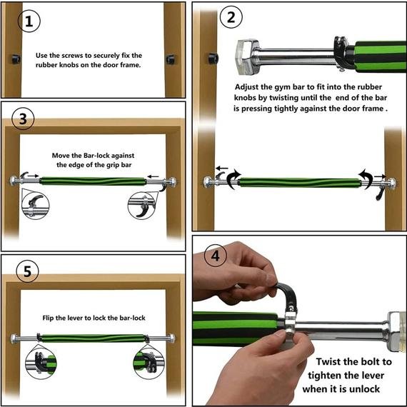 This Adjustable Length Doorway chin ups Bar is perfect for you to do fitness at home. like pull-ups. chin-ups. hanging leg raises. sit-ups and crunches. you just need minimal space. It is easy to mount it on the door frame with rubber knobs for secure hold.Exclusive bar-lock equipped. and Unique design hexagon shape gasket. effective to prevent unscrew the bar unconsciously when exercise. and rotation of the bar. avoid accident thoroughly. The Non-slip and moisture-absorb provide extra comfort to minimize hand fatigue.