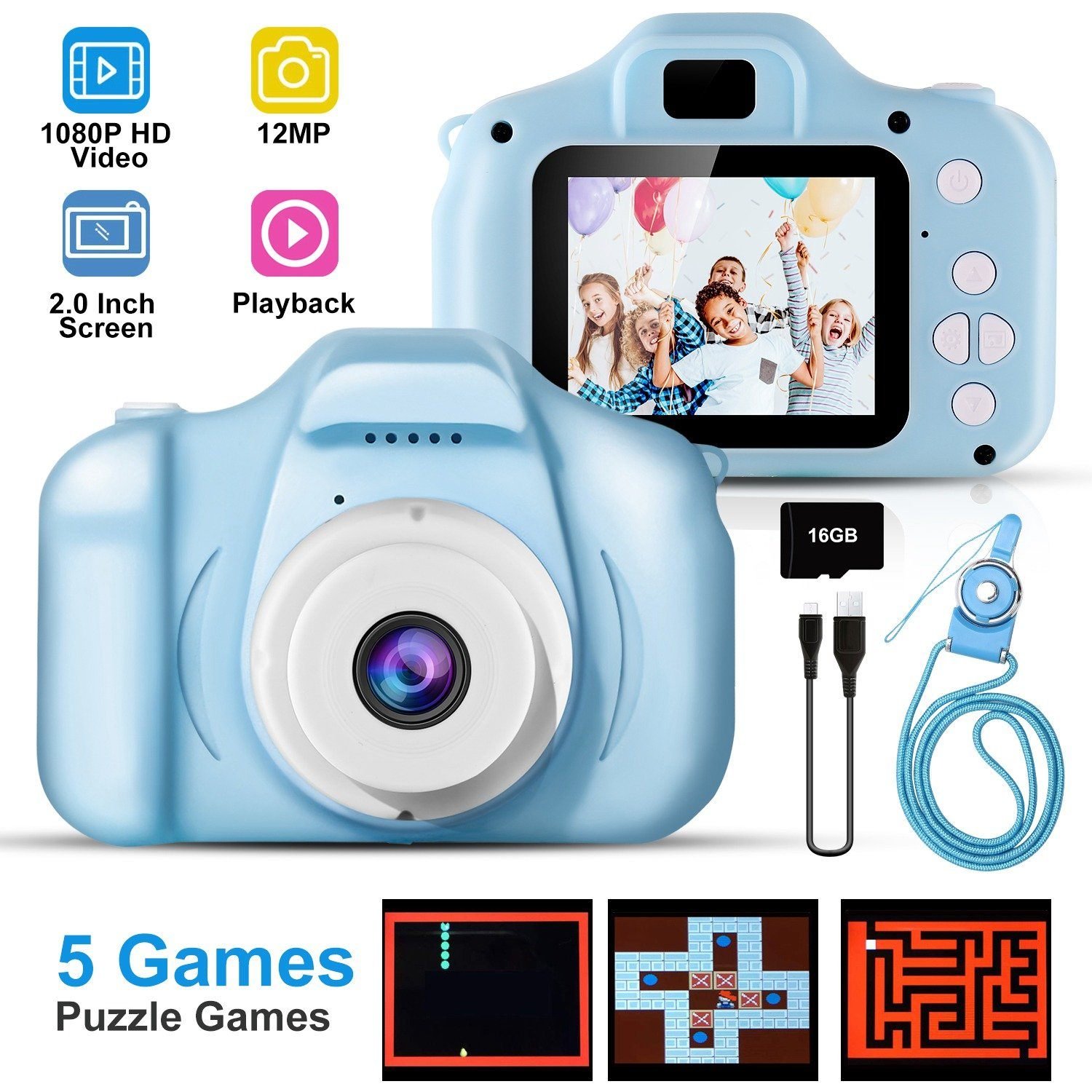 Our iMounTEK kids digital camera is specially designed for children to easily take photos or video for recording their memorable childhood moments while to cultivate their photography hobbies. Equipped with 2.0-inch screen. 12MP photos. 1080P videos. this kids digital camera can take up to 1920x1080P videos. equipped with 4x digital zoom. will catch the clear wonderful joy moment for boys or girls. Meanwhile. kids digital camera comes with more functions. like photo capture. video recording. playback. recording. etc. Also there are 7 scene selections and 15 cute photo frames for children to select their favorite scene or photo frame. which is amazing to bring more fun to your kids. Made of high-grade ABS materials. which is shockproof and safe for your little ones; With attractive outlook design. multi functions and 5 types of puzzle games for entertainment. this kids digital camera will be wonderful Birthday. Halloween. Christmas. New Year gifts for children.