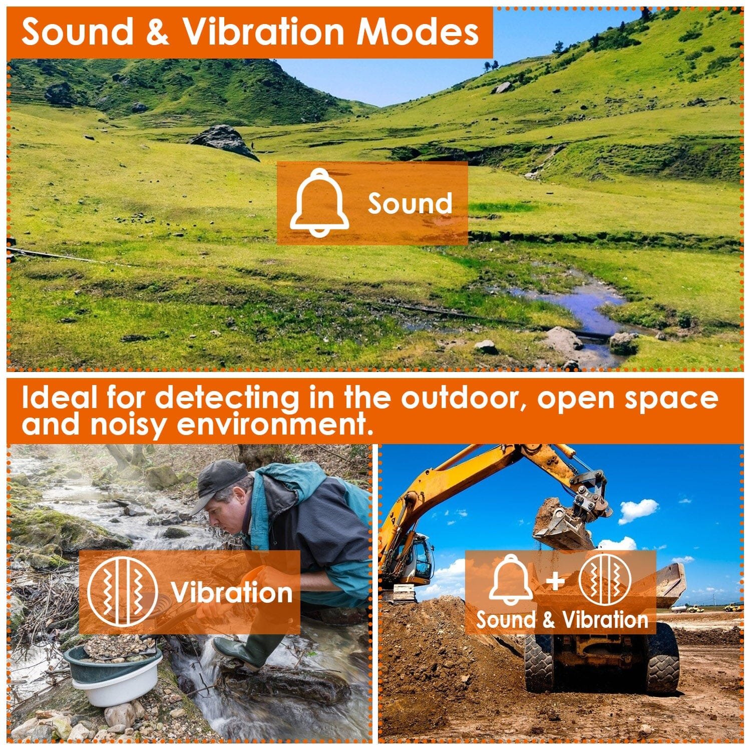 • Sound & Vibration Modes: Featured with sound mode. vibration mode. ideal for detecting in the outdoor. open space and noisy environment. And LED lighting allows you to detect in dim night.