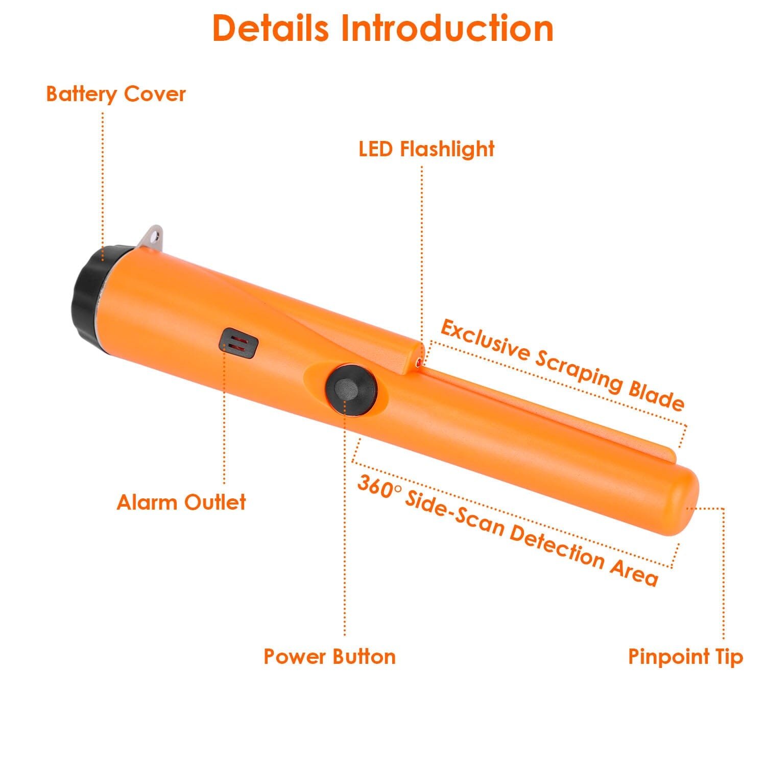 Featured with sound mode. vibration mode. our metal detector is ideal for detecting small objects. locating nails and metal. etc.. LED lighting allows you to detect in dark night. Just hold the metal detector horizontally to scan large areas quickly to precisely locate the target. And 3.62in scraping blade on the detector aid to rake. scrape or flatten the soil while side-scanning. It is easy to detect.