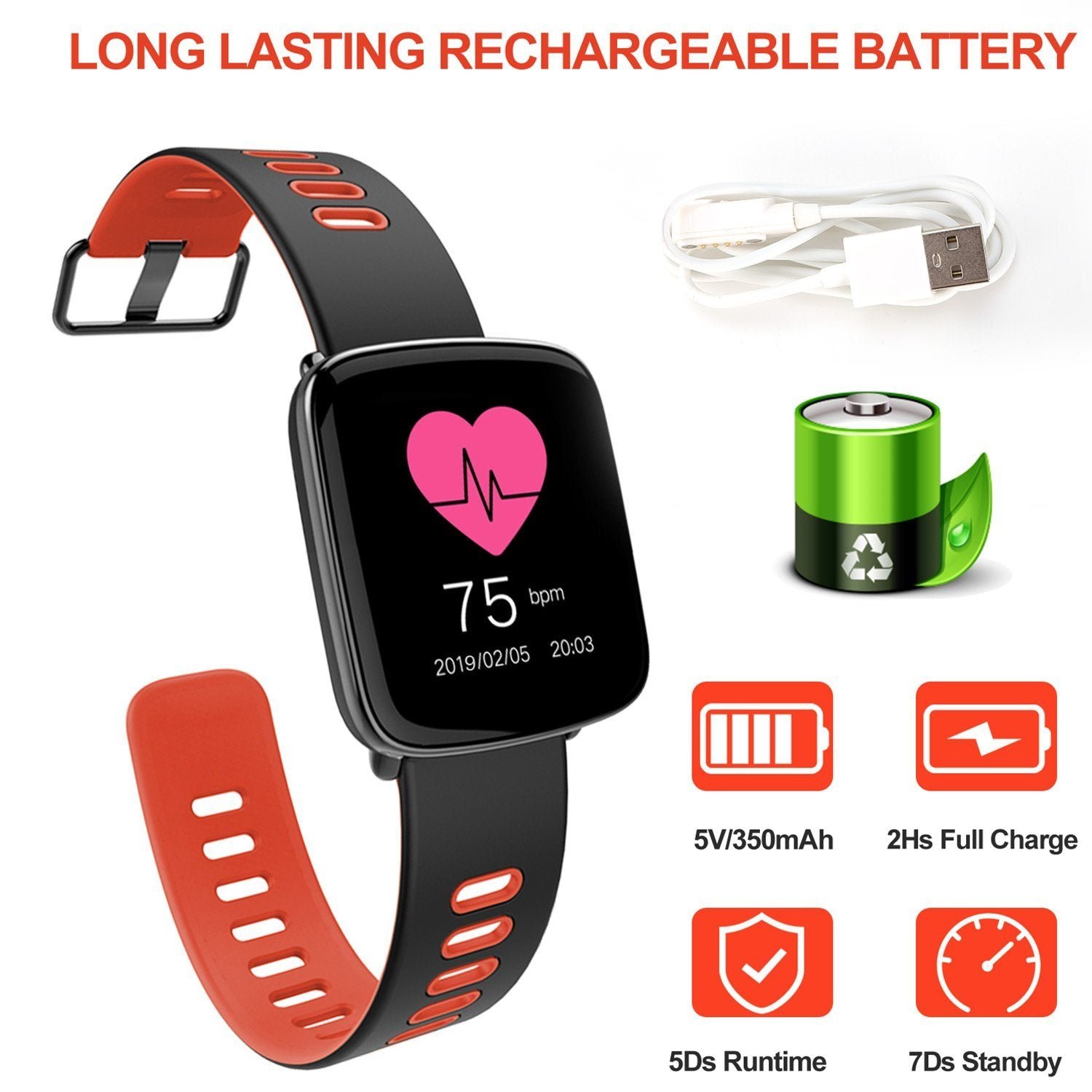 • LONG BATTERY LIFE: Built-in 5V 350mAh li-polymer rechargeable battery. after about 2 hours full charge. our smart watch can work approx. 5 days and standby approx. 7 days.