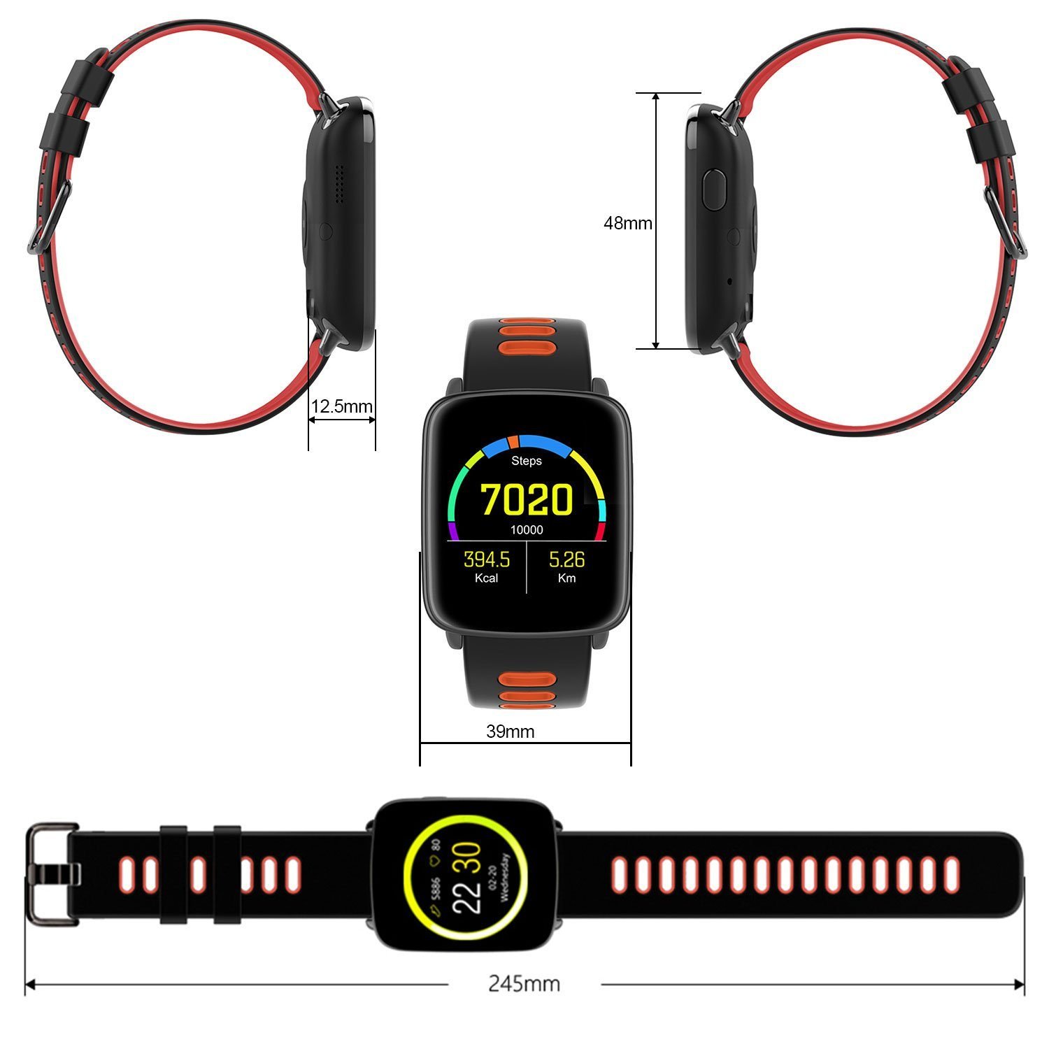 Adjust yourself for a healthier lifestyle with our 1.54» large touch screen fitness smart watch! It can automatically record your all-day activity tracker such as heart rate monitor. pedometer. and sleep monitor as well as provide drink reminder. sedentary reminder. alarm clock function. etc. And. with V4.0 wireless technology. after paring with smartphones with Android 5.0 and above or iOS 8.0 and above system. it can realize functions such as remote camera control. music control. calls-answering/rejecting control. phonebook and call history synchronization. messaging-notifying. smartphone anti-lost. etc. Additionally. it is IP68 waterproof to remove worries about hands washing. splashing. sweating. rainy. etc. And after about 2 hours full charge. it can work approx. 5 days and standby approx. 7 days.