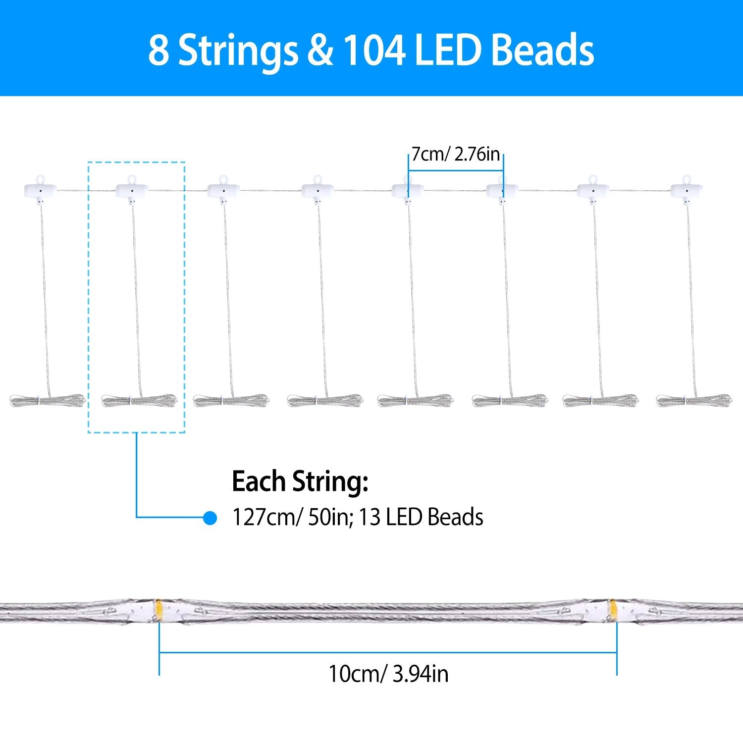 - IP65 Waterproof: 104 LED lights and 8 strings. 13 LED lights per string. Each string. designed with super soft copper wire. can be moderately bent to any shape. The waterproof level of the battery box reaches IP65. It is protected from water and dust. suitable for varieties of weather.
