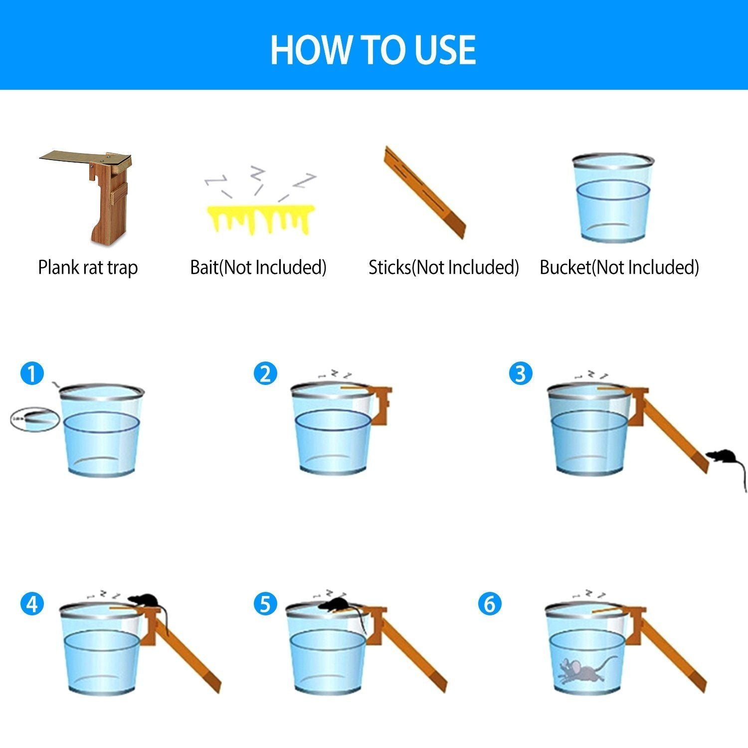 - Firstly. you just need to pour water in the bucket and clip the trap on the edge of the bucket; secondly. set a stick on the bucket; thirdly. just put some bait on the plank. And everything is OK. you just need to wait the mouse falling down in the bucket.