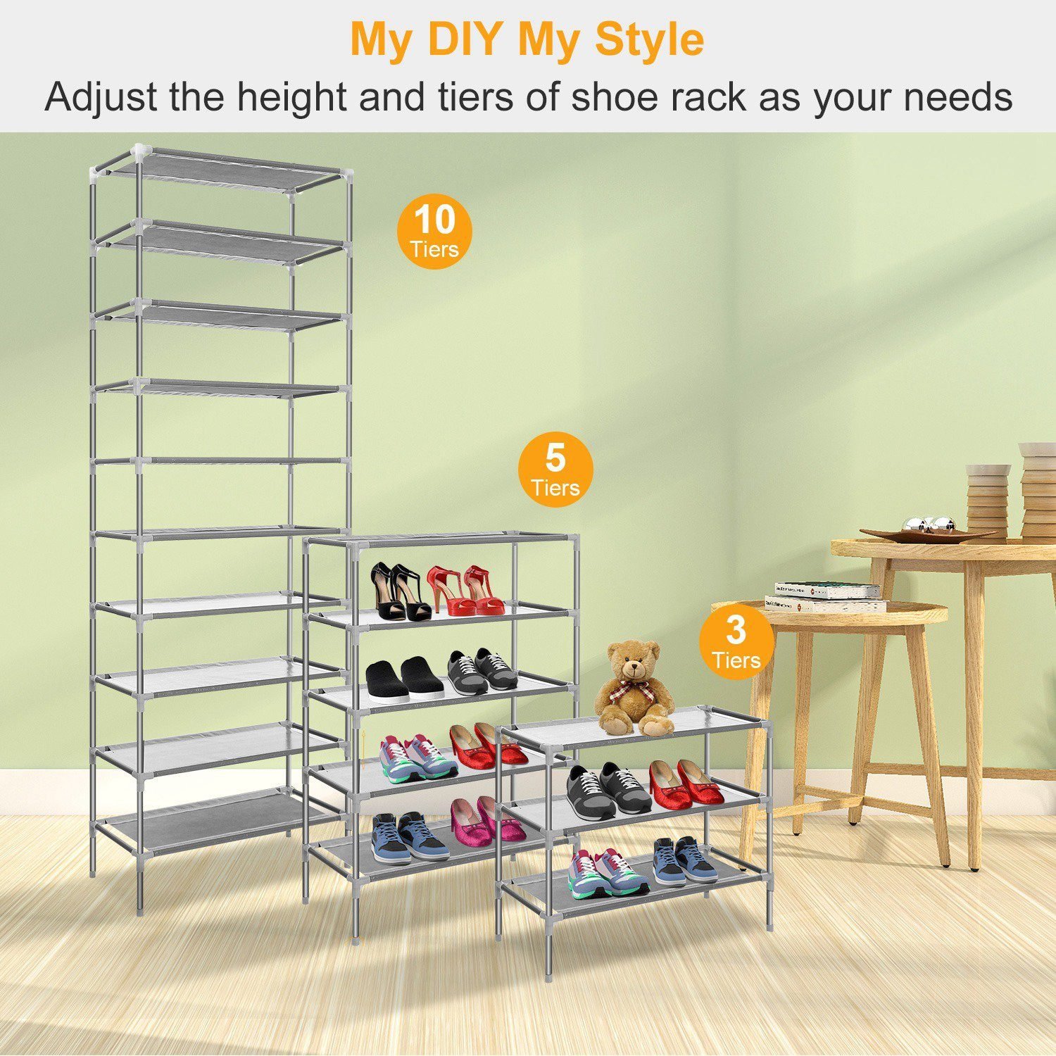 - 27-PAIR SHOES STORAGE ORANGER: Our 10-tier shoe rack holds at least 27 pairs of shoes to keep your entryway. closet. hallway or mudroom away from mess.