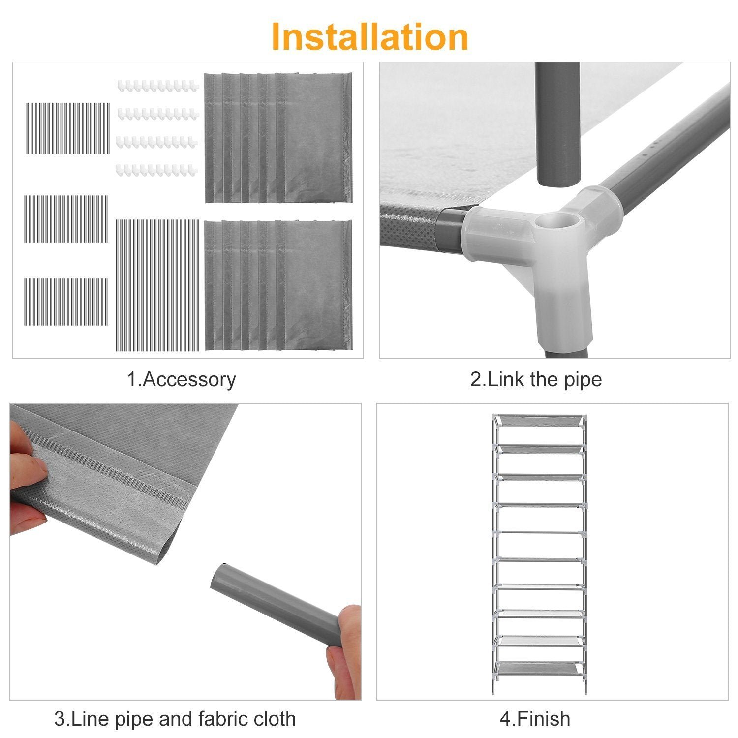 Our shoe rack adopts non-woven fabric and iron tubes. stubborn and well- constructed. Its design enables our shoes to display in a tidy and cleaning style. multi-parts will be assembled quickly and fastly.10 Tiers with 22.04lbs max load per cell to hold at least 27 pair shoes. Interlayer cell can be removed and to store larger items. such as handbags. toys and boxes. etc.. An good helper for housewife.