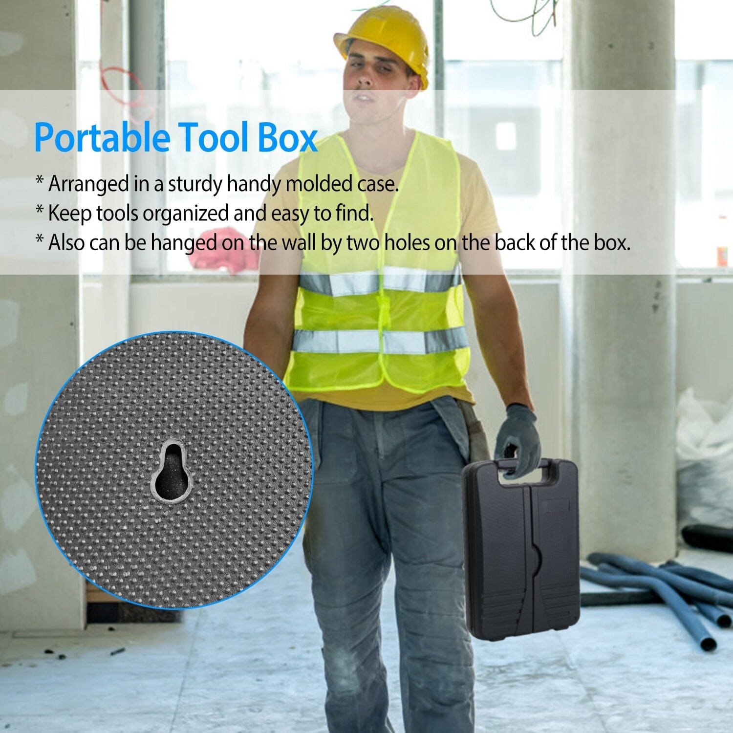 • Convenient Tool Box: Tools are neatly arranged in a sturdy handy molded case to keep them organized and easy to find. The compact carrying case fits your home. apartment. garage. or even the car. You can also hang it on the wall through the two holes on the back of the box.