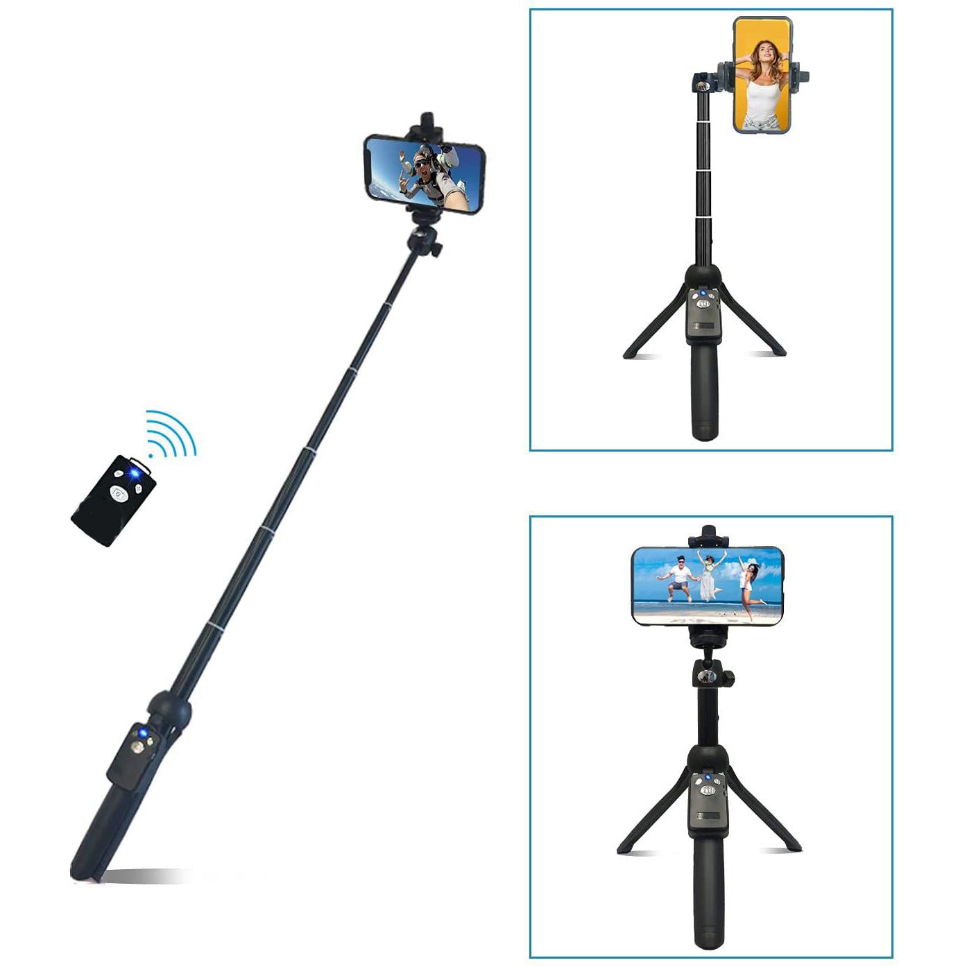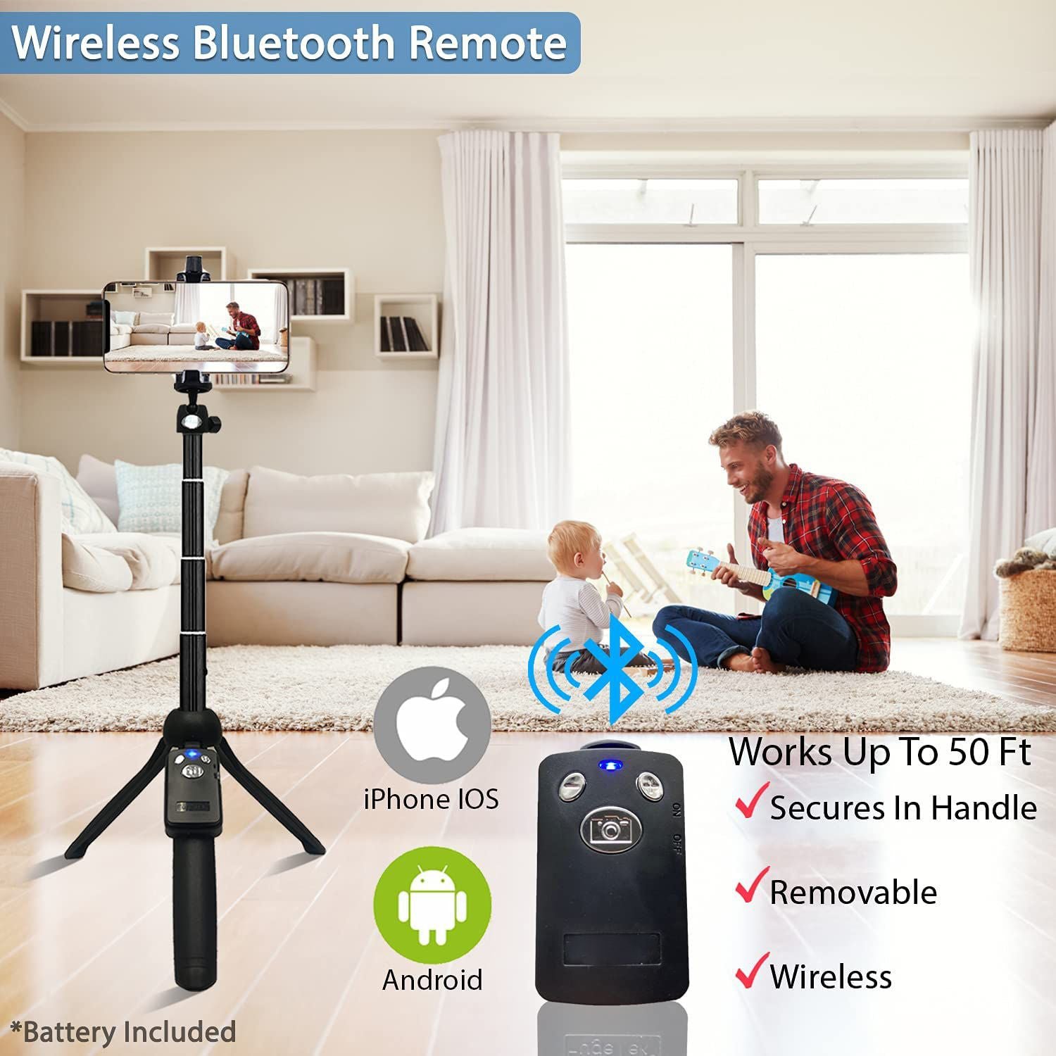 - Fast Connecting Wireless Bluetooth Remote: Use with different devices. Compatible with iPhone iOS. Android 4.3 or newer. small Digital Cameras.(*iOS has no zoom feature. Zoom works on limited Android devices. Bluetooth may be incompatible with some cameras). Remote safely secures in handle. or canbe removed.
