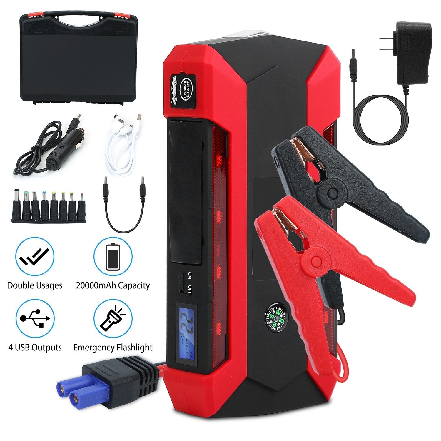 - Portable Power Bank: Designed with 4 USB outputs 5V/2.1A. which can be used as a power bank and you can charge smartphones. tablets and so on. This is a multi-function emergency car jump starter and battery charger.