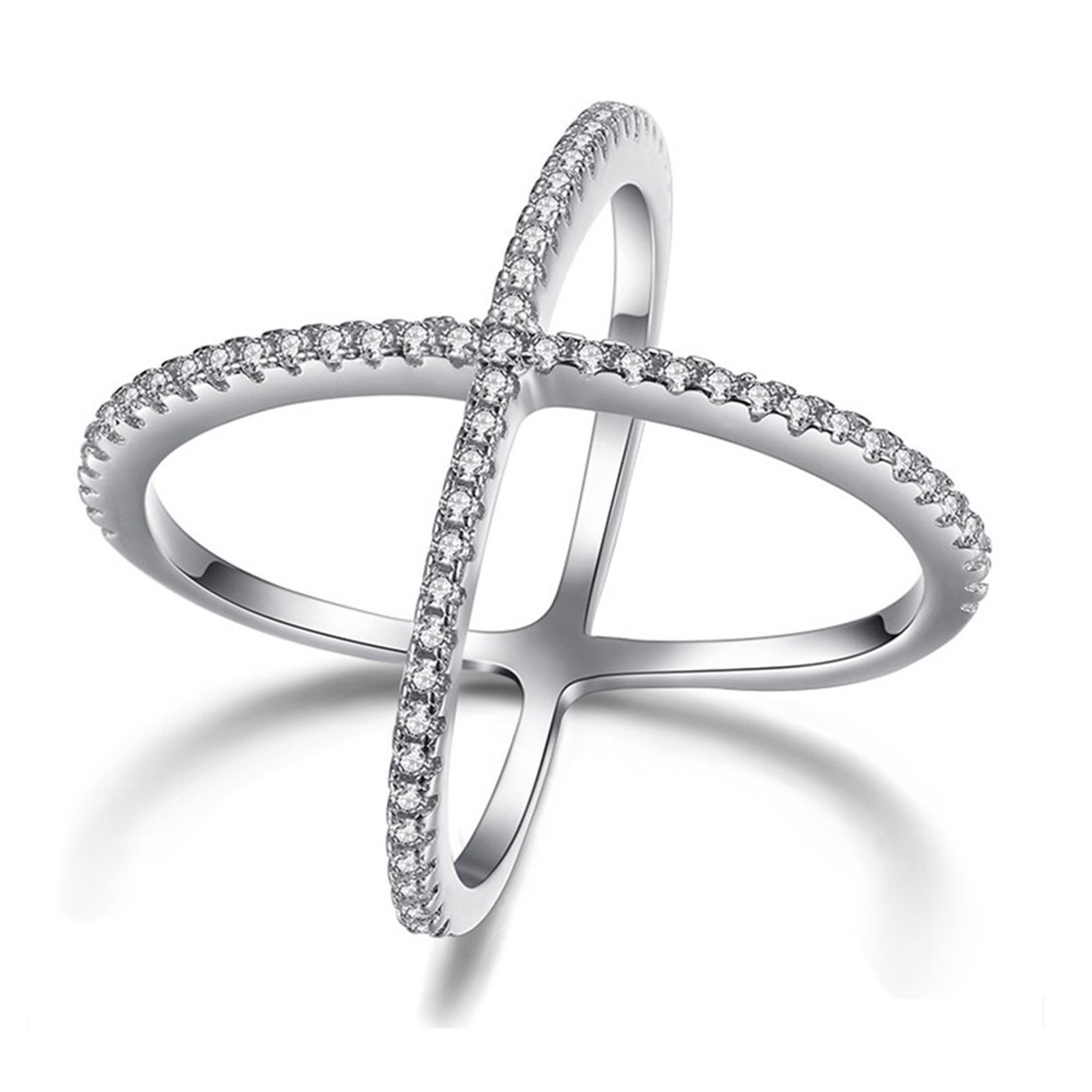 18k white gold plated brass.Cubic Zirconia Pave X Ring.