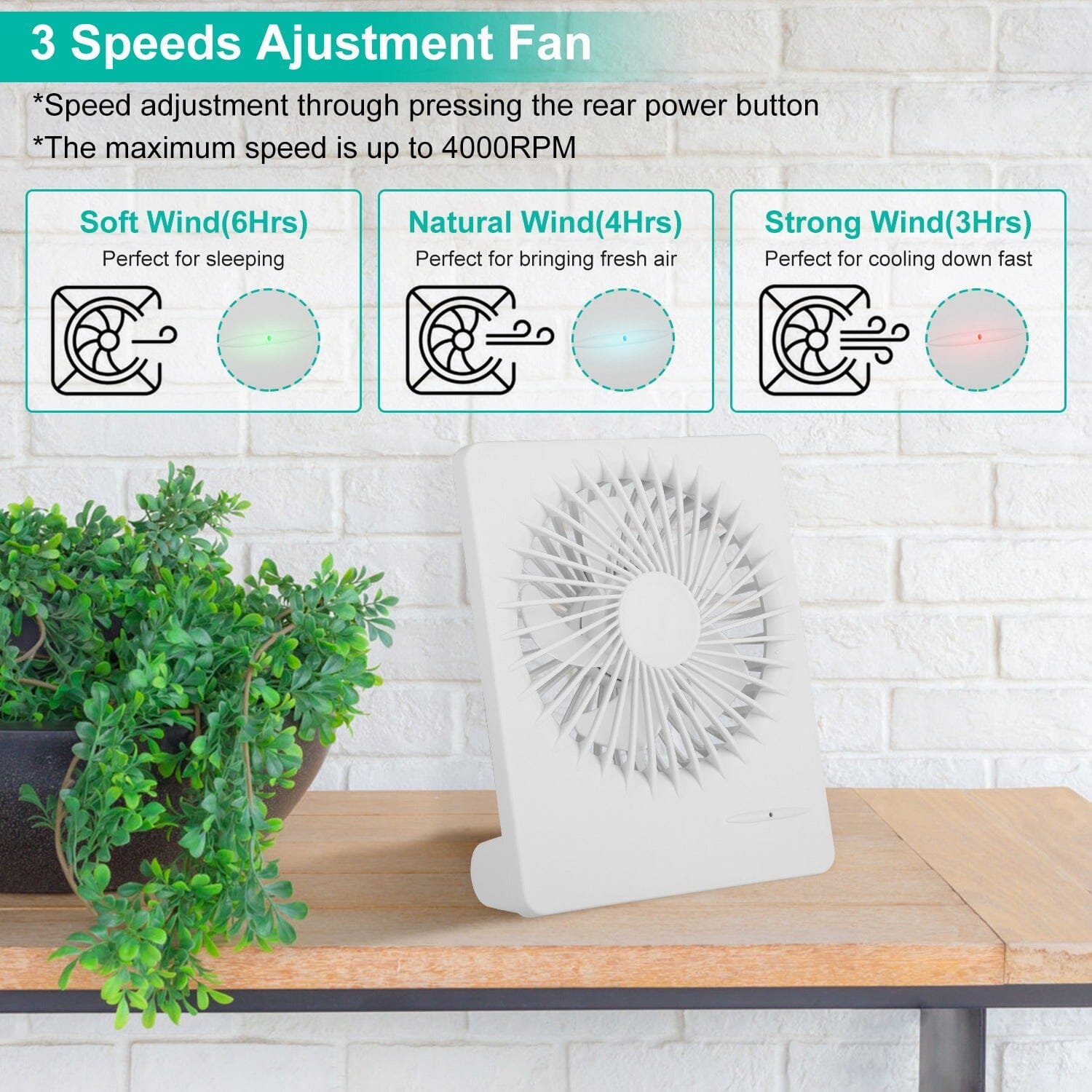 - Rechargeable Fan: Our desk fan can be 1-2Hrs fully charged and last for 6Hrs. 3 Speed adjustment meet your different demands. One button disperses heat.