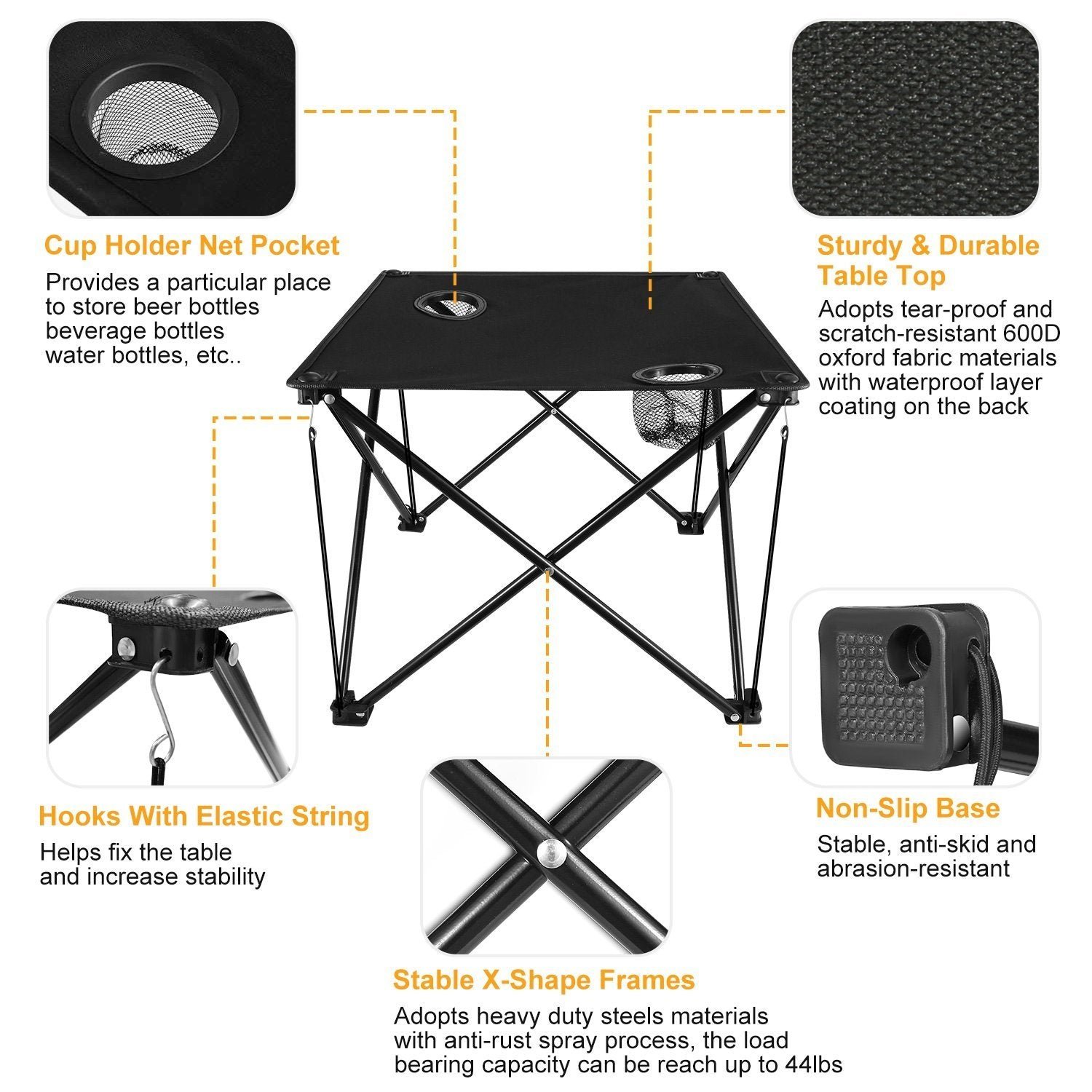 No matter you are a camper. a backpacker. or just out for a picnic. our lightweight portable folding table will be a good assistant to help place your foods. vegetables. fruits. water bottles and other items you needed. The table top is made from tear-proof and scratch-resistant 600D oxford fabric materials with waterproof layer coating on the back and the X-shape frames which adopt heavy duty steels with anti-rust spray process can increase the load bearing capacity to reach up to 44lbs. And it is easy to setup. no tools needed.
