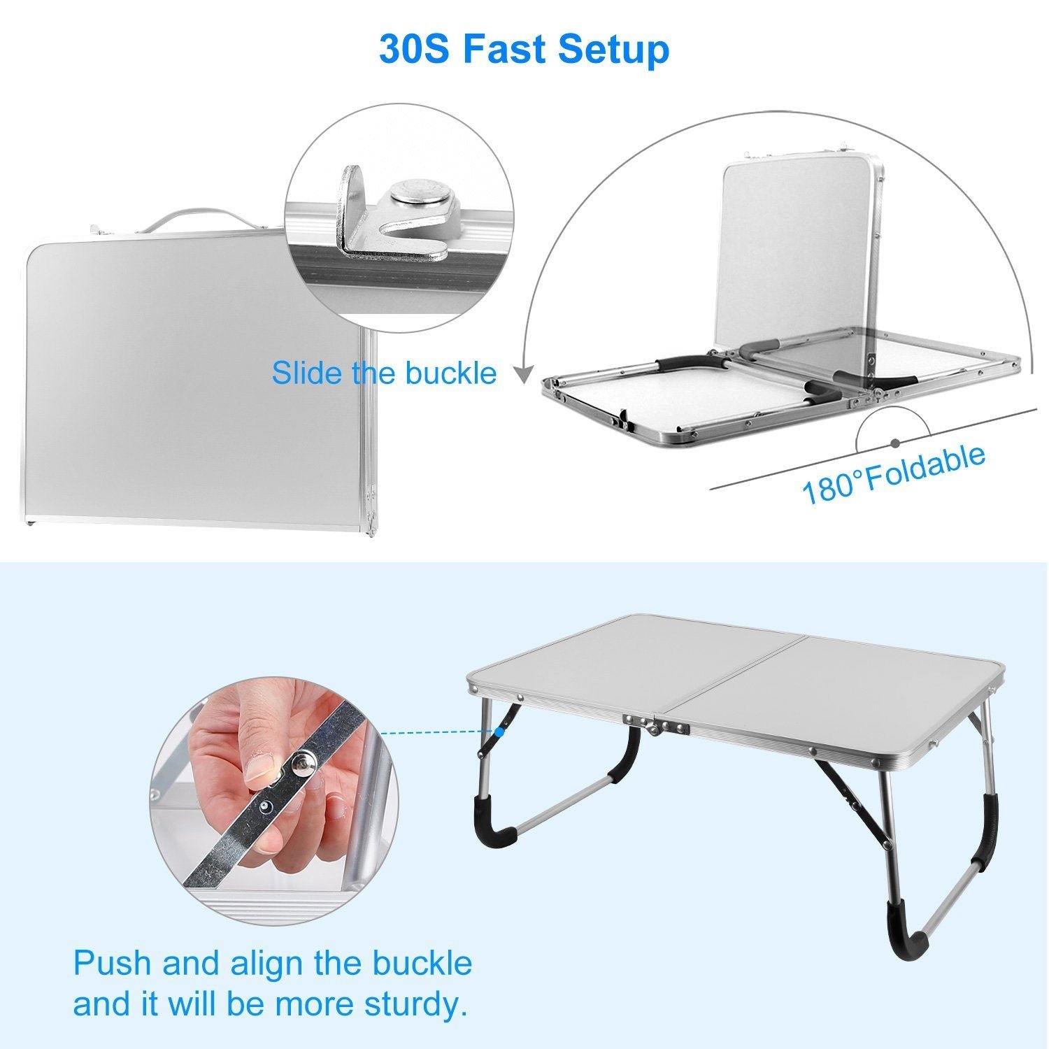 • Just simply pull out foldable leg and set up the table by supporting buckle within 30 seconds