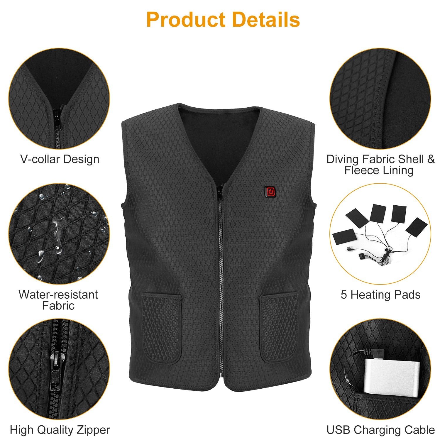 - USB Port Heating Vest: Come with USB cable. it is better for you to carry a power bank (5V/2.1A max output). Zipper design is quick to wear and hand pocket to accommodate your power bank (Power bank not included).