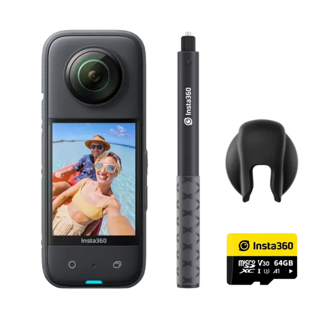 - In the box: 1x Insta360 X3. 1x 114cm Invisible Selfie Stick. 1x 64GB microSD Card. 1x Lens Cap.