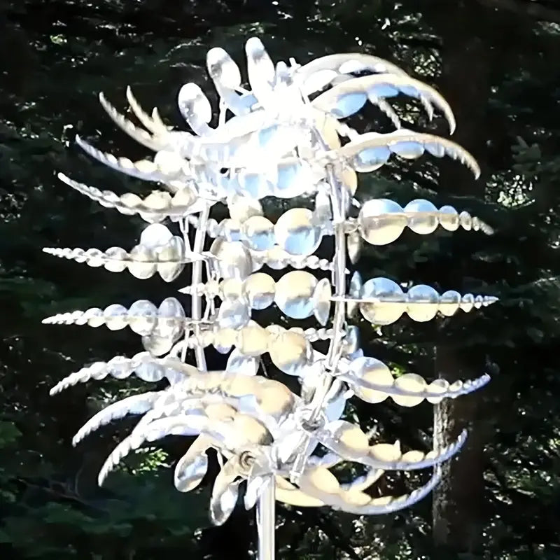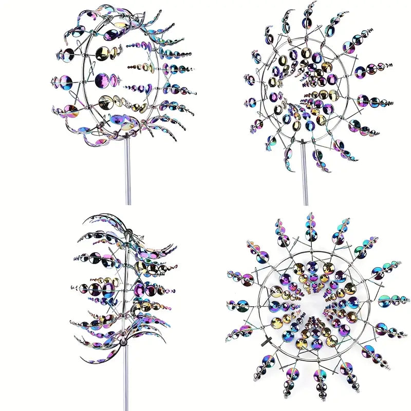 Magical metal windmill.the two tiers blades smoothly rotate in opposite directions on sealed bearings. Featuring modern functionality with period charm. our durable yard wind spinners have a stability stake at the base to ensure its firmly planted for windy days.