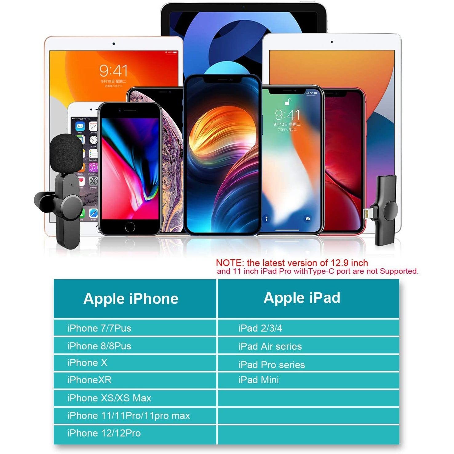 - Compatible with iPhone/iPad with lightning connectors: The wireless lavalier microphone can work with iPhone 5/6/7. 7 Plus. 8. 8 Plus. X. XR. XS. XS Max. 11. 11 Pro. 11 Pro Max.12/12 Pro. and iPad 2/3/4. iPad Air series. iPad Pro series (NOTE: the latest version of 12.9 inch and 11 inch iPad Pro with type-c port not supported).