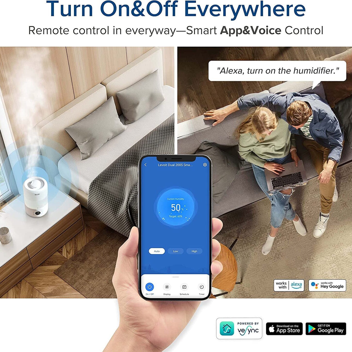 • Smart Control: Set timers and schedules. set a target humidity. connect to voice assistants. and more.