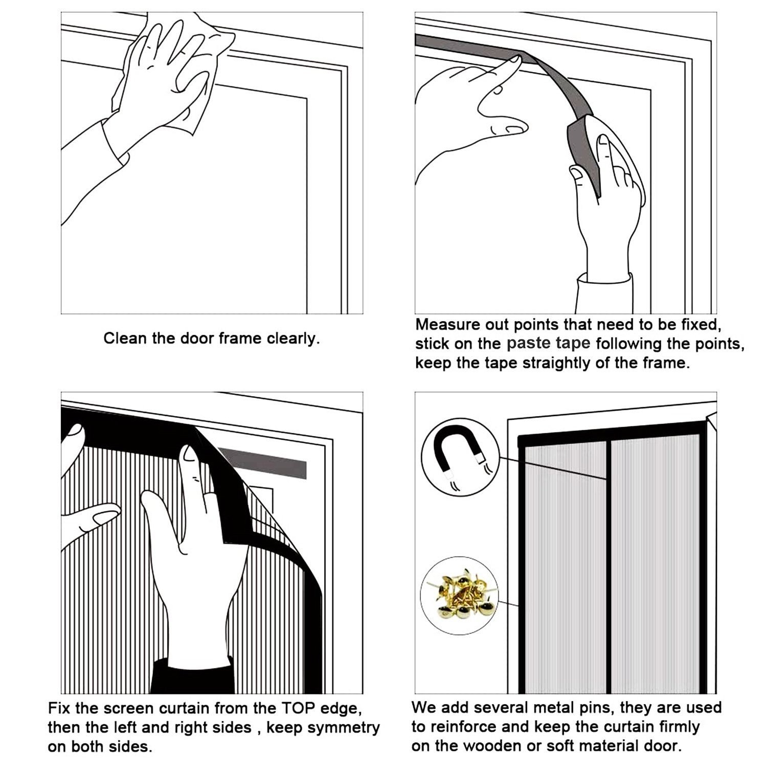 - For Wooden frames. you can also use the push pins provided for reinforcement. Please note that the push pins leave puncture holes on the door frame.