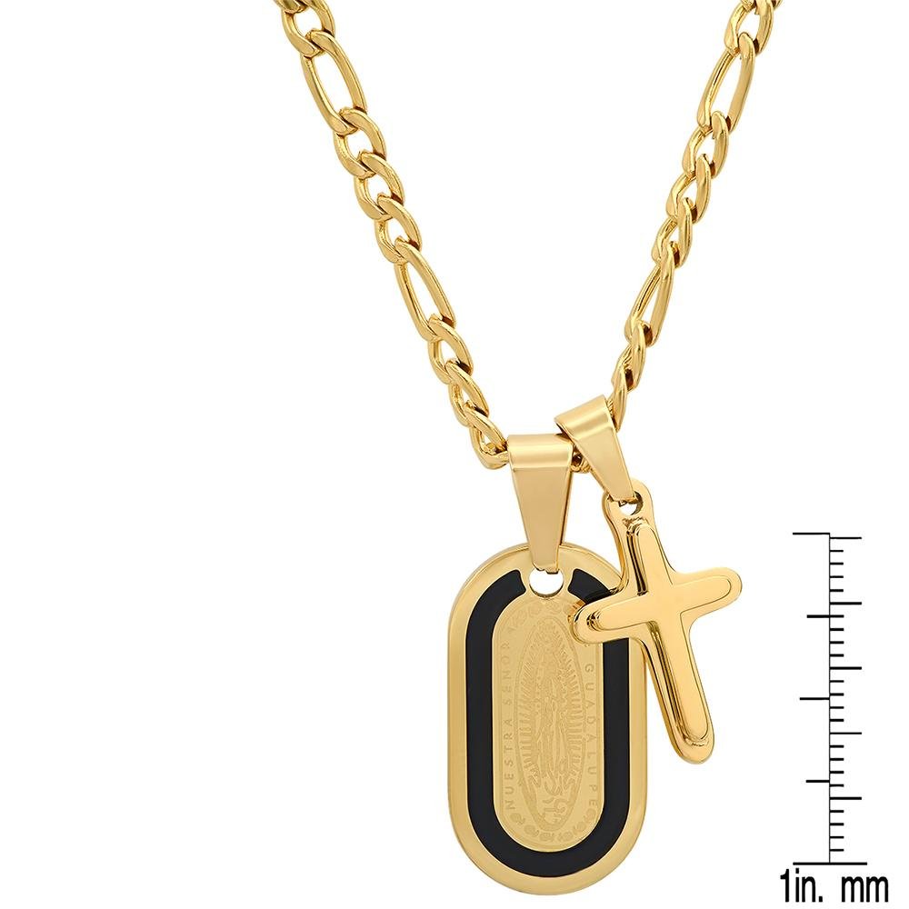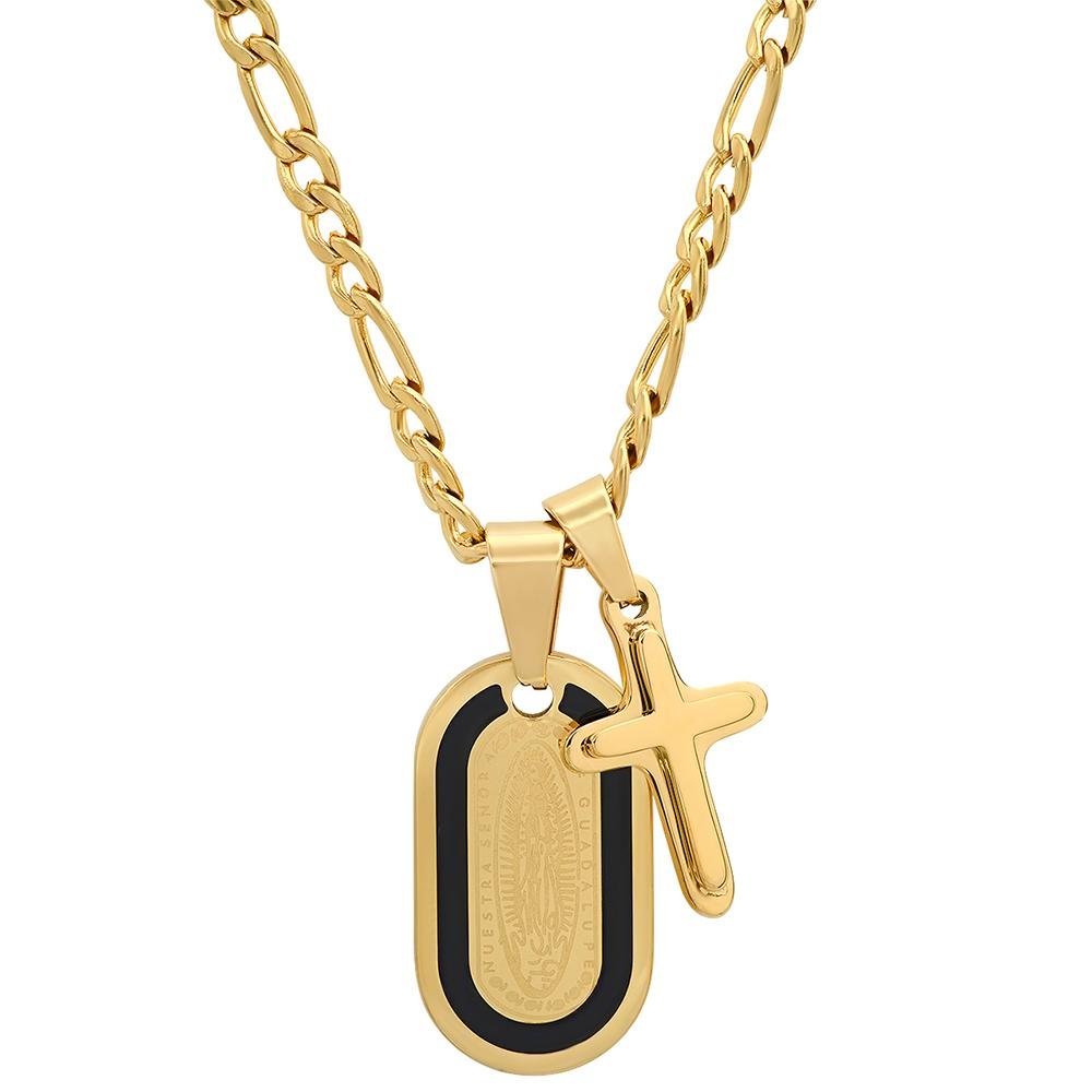 Men’sSilver or 18k gold plated stainless steeldog tag Lady of Guadalupe and Cross pendant.