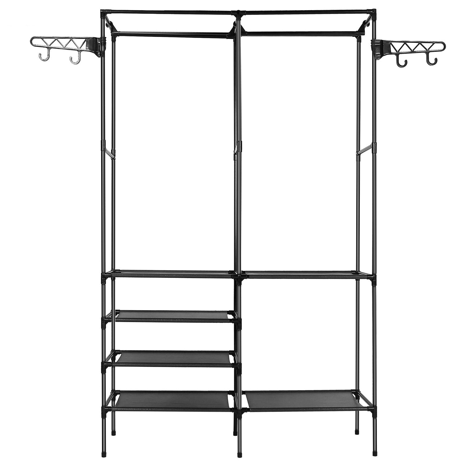 - Perfect Closet Organizing System: Dimensions: 66.1×42.1×14.2in.This garment rack is great for creating storage space to organize your clothes and shoes in your laundry room and bedroom. Two hanging rods can hang coats. long dresses. jacket. and other heavy clothes. 4 layers of shelves add extra space to store beddings. shoes. and boxes. Two side hooks are designed for bags and scarfs. Make your room tidy and organized with this rack.