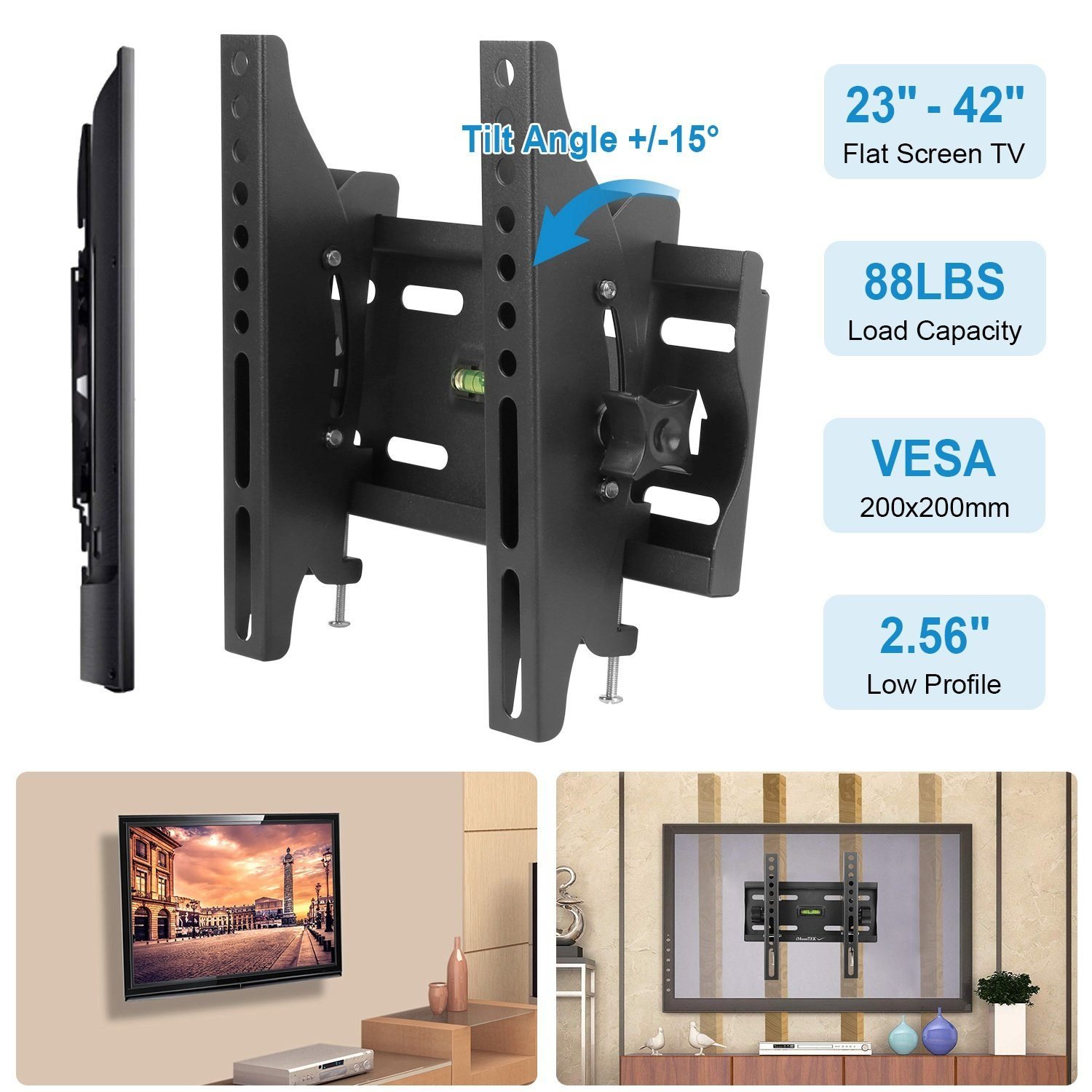 - 15??forward/Backward Tilt & Universal Fits: Our TV wall mount bracket with 15??forward tilt or 15??backward tilt can provide a comfortable TV-watching experience and can fit most 23″-42″ LED/LCD/PLASMA flat screen TV with VESA mounting holes patterns of 200x200mm (8″x8″).