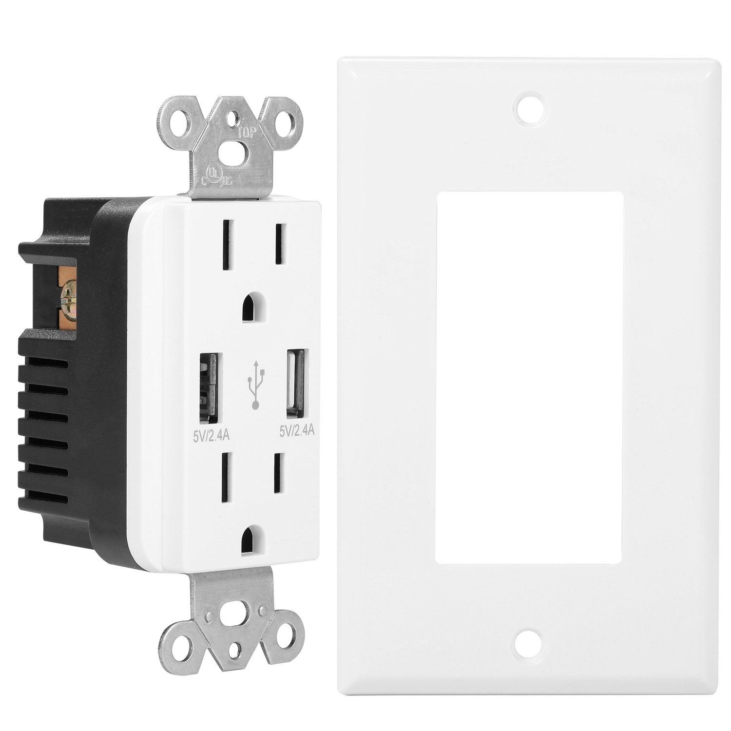 Our USB wall outlet adopts flame-retardant PC and premium phosphor bronze material. durable and secure. Equipped with dual USB charge ports with total 2.4A output (single USB max. output is 2.4A) and its built-in smart chip can identify different charging current needs of devices and optimize charging current to speed up charging time and keep safe charge. Additionally. it is easy to install and can be widely used to charge your phones. tablets. power bank or other mobile devices. Easily install it in your kitchen. living room. and bedroom and so on.