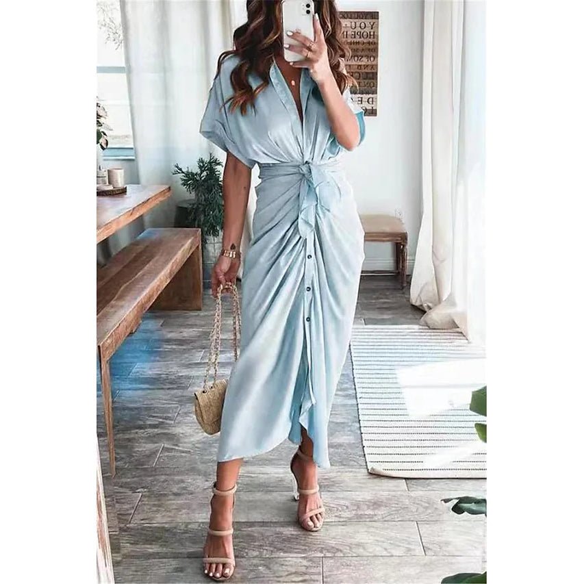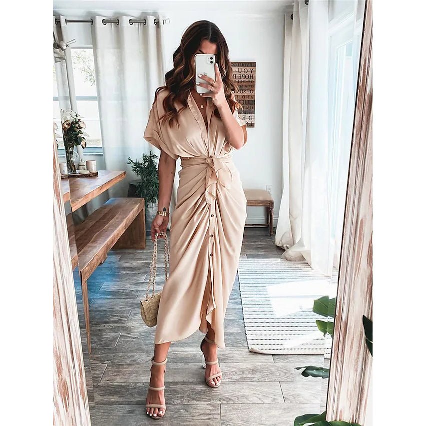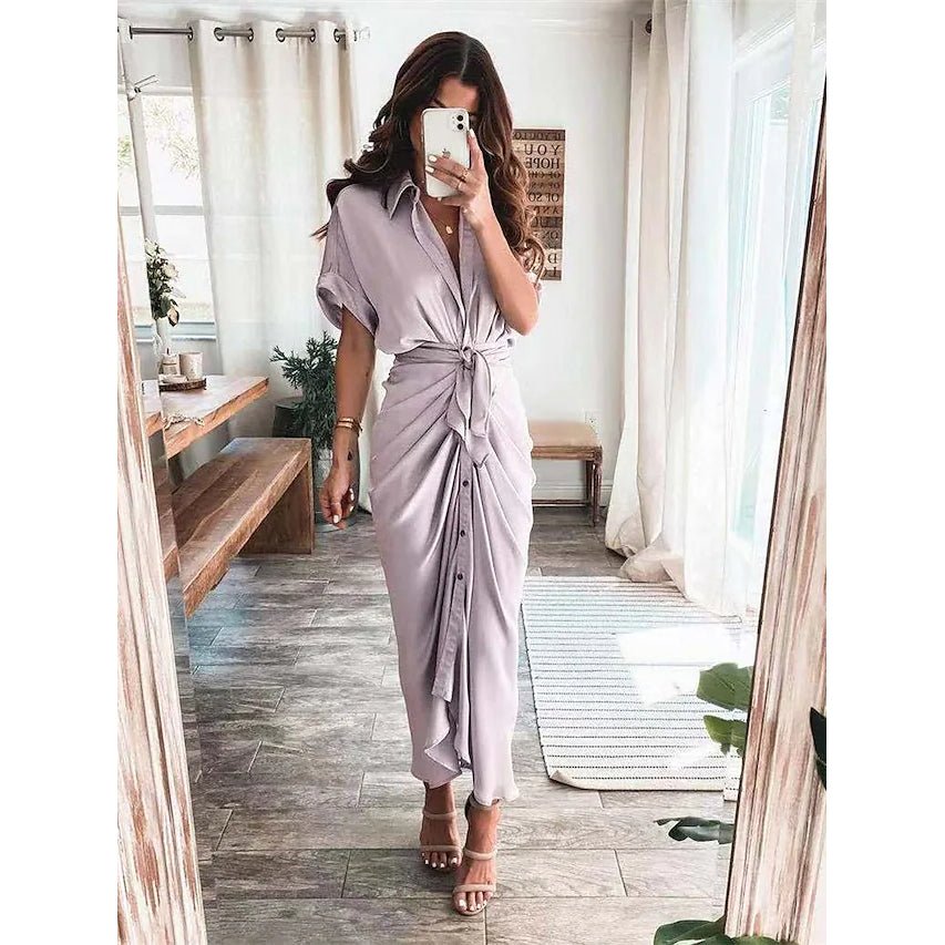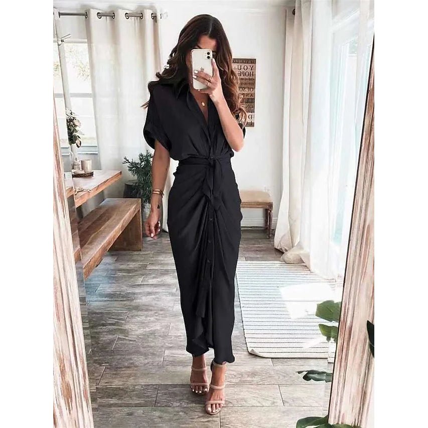 Women’s Shirt Dress Maxi long Dress Short Sleeve Solid Color Ruched Lace up Button Fall Spring Shirt Collar Elegant Casual Party.